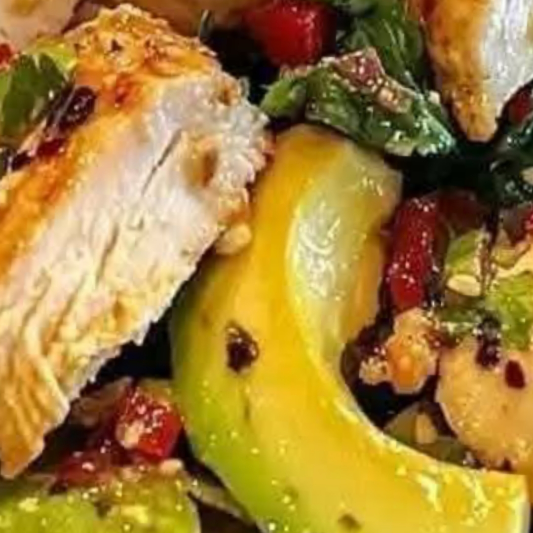 1. Combine the Salad Ingredients:– In a large mixing bowl, combine the shredded chicken, avocado slices, red onion, kalamata olives, sun-dried tomatoes, crumbled feta cheese, and pine nuts.– Optional: Toast the pine nuts in a dry skillet over medium heat until golden brown, then let them cool before adding to the salad.2. Prepare the Dressing:– In a separate bowl or jar with a tight-fitting lid, combine the olive oil, Greek yogurt, mayo, salt, pepper, garlic powder, dried dill, sugar, white wine vinegar, and lemon juice.– Whisk or shake well until all ingredients are thoroughly combined.3. Assemble the Salad:– Drizzle the dressing over the salad ingredients in the bowl.– Gently toss everything together until the dressing coats every component evenly.– Taste and adjust seasoning if needed.4. Serve:– This salad can be served immediately or refrigerated for a short time to allow the flavors to meld.– It’s perfect as a side dish for a summer party or a delicious meal on its own.—Tips:– Make Ahead: Prepare the salad and dressing separately, then combine just before serving to keep the avocado fresh.– Add Greens: Serve over a bed of mixed greens or spinach for extra freshness.– Protein Boost: Add chickpeas or grilled shrimp for an extra protein boost.– Storage: Store leftovers in an airtight container in the fridge for up to 2 days.—Enjoy this vibrant and wholesome Greek Avocado Chicken Salad—a perfect blend of Mediterranean flavors that’s both satisfying and nutritious!