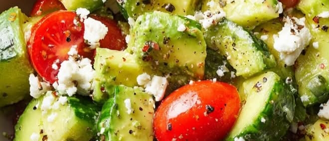 1️⃣ In a large bowl, combine avocado, cucumber, and tomatoes.
