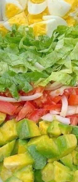 - Arrange chopped eggs, lettuce, tomato, onion, and avocado in a bowl.