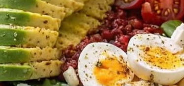 2️⃣ Arrange avocado slices, eggs, tomatoes, corn, onion, and cheese on top.