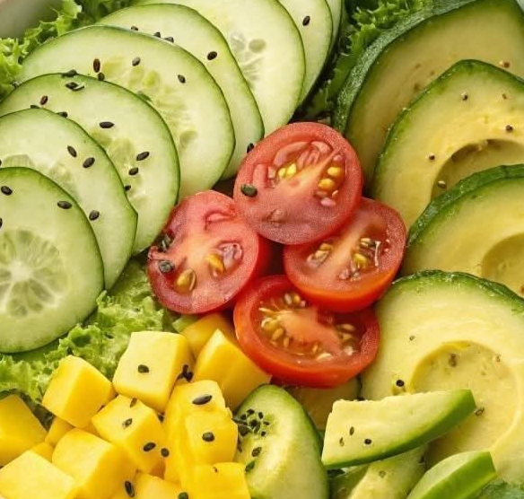 Arrange cucumber slices, avocado slices, diced mango, and cherry tomatoes on top.