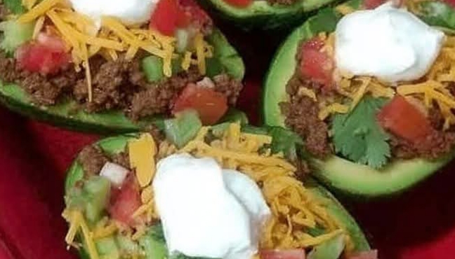 Fill the avocado shells with the taco meat and top with shredded cheese, sour cream and salsa.