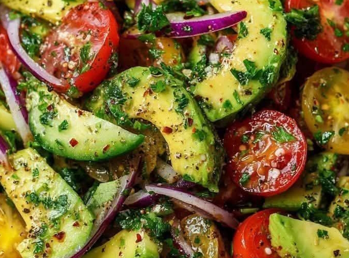 In a bowl, combine avocado slices, cherry tomatoes, and red onion.