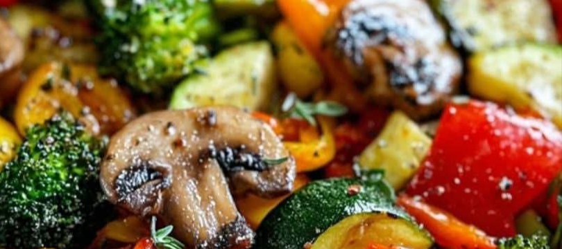 A colorful and healthy side dish featuring a medley of fresh vegetables, roasted to perfection with a touch of balsamic vinegar and thyme.