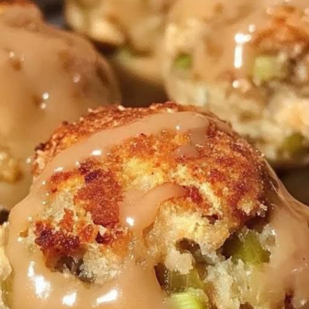 Get the mixture ready. In a big bowl, mix together the leftover stuffing, shredded turkey, cranberry sauce (if you have it), and shredded cheese. Slowly pour the sauce or broth little by little until the mixture sticks together and is wet enough to keep its form when squeezed. If the mix is not moist enough, put in more gravy. If it’s too wet, add more stuffing or breadcrumbs.Form Balls: With your hands or a cookie scoop, shape the mixture into balls the size of golf balls, pressing firmly to make sure they stay together. Put the shaped balls on a baking sheet covered with parchment paper.Prepare a dredging station by placing three shallow bowls: one with flour, one with beaten eggs, and one with breadcrumbs. Cover each stuffing ball with flour, then dip it in beaten eggs, and finally roll it in breadcrumbs, pressing softly to make them stick.Cool the stuffing balls: To get the best outcome, put the coated stuffing balls in the refrigerator for 15-20 minutes. This helps them become firmer and keeps them from breaking apart when frying.Cook the meatballs: In a deep pan or pot, heat around 2 inches of oil over medium heat until it reaches 350°F (175°C). Add the stuffing balls little by little, cooking them until they are golden and crispy all around, which should take about 3-4 minutes. Use a spoon with holes to take out the balls and let them dry on paper towels.Another way to bake: If you want a lighter choice, you can bake the stuffing in ball form. Heat your oven to 400°F (200°C) and put the balls on a baking sheet that has been greased. Spray them lightly with cooking spray and bake for 20-25 minutes, or until they are golden and hot.Serve the stuffing balls warm with turkey gravy, cranberry sauce, or your preferred dipping sauce. Add some chopped parsley on top for a fresh flavor.Advice for Making the Best Turkey Stuffing BallsYou can use either fresh or old stuffing in this recipe, it will still turn out well. If the food is too dry, simply add more sauce or broth to make it moist.Personalize the Add-ins: Feel free to be creative with the extra turkey stuffing balls. Include diced vegetables, herbs, or a small amount of mashed potatoes to enhance the taste.Prepare in advance and freeze: You can make these stuffing balls ahead of time and freeze them before frying. Just form, cover, and put in the freezer on a baking tray. Once it’s frozen, put it in a zip-top bag. When you are ready to cook, you can fry or bake them directly from the freezer. Just remember to add a couple of extra minutes to the cooking time.To make a healthier version, you can use an air fryer to cook the balls at 375°F (190°C) for around 10-12 minutes until they are crispy and golden brown.Have fun!