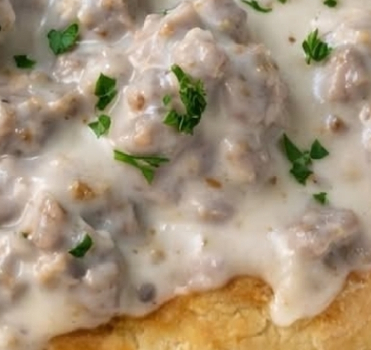 Split the warm biscuits in half and place them on a plate similar to your photo. Generously spoon the thick sausage gravy over the top, allowing it to cascade down the sides. Sprinkle with fresh parsley if desired and serve immediately.