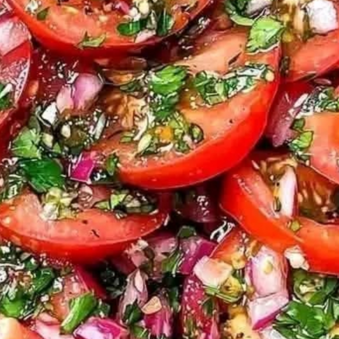 1.5 pounds ripe tomatoes (heirloom, cherry, or vine-ripened), sliced or chopped6 tablespoons extra virgin olive oil2 tablespoons red grape vinegar (or red wine vinegar)1 garlic clove, finely minced or grated1 teaspoon Dijon mustard (optional, for a touch of tang and body)1 teaspoon honey (optional, balances acidity)½ teaspoon salt (or to taste)Freshly ground black pepper, to taste¼ cup fresh herbs, chopped (basil, parsley, thyme, oregano, or a mix)1 small shallot, finely sliced (optional for extra depth)🔹 Step 1: Make the Herb VinaigretteIn a small bowl or jar, whisk together olive oil, vinegar, garlic, mustard, honey, salt, and pepper.Stir in the fresh chopped herbs and shallot if using. Let sit for 5–10 minutes to meld the flavors.🔹 Step 2: Prepare the TomatoesWash and slice tomatoes into wedges, rounds, or bite-sized chunks, depending on the type.Arrange tomatoes in a shallow bowl or serving dish.🔹 Step 3: MarinatePour the vinaigrette over the tomatoes and gently toss to coat.Let sit at room temperature for 15–30 minutes before serving to allow the flavors to absorb.🍽️ Servings:Serves 4–6 as a side dish or appetizer💡 Notes & Tips:Tomato Tip: Use the ripest tomatoes you can find — color and smell are good indicators.Make It Heartier: Add sliced mozzarella, avocado, or crusty bread to make it a light meal.Chill Factor: Best served at room temperature. Avoid refrigerating tomatoes before use; it dulls their flavor.Leftovers: Great the next day — spoon over toast or mix with pasta or grains.🧠 Health Benefits:Rich in Lycopene: Tomatoes are packed with antioxidants that support heart health.Healthy Fats: Olive oil helps absorb fat-soluble vitamins (A, D, E, K) and enhances satiety.Low in Calories: Naturally light and hydrating — perfect for warm weather or light meals.🧾 Nutritional Info (per serving – approx.):Calories: 140Fat: 12gCarbohydrates: 6gFiber: 2gProtein: 1gSugar: 4gSodium: 180mg(Based on 6 servings; may vary depending on tomato type and additions.)❓ Q&A:Q: Can I use dried herbs instead of fresh?A: Yes, but reduce the amount to 1–2 teaspoons total. Let the vinaigrette sit longer so the flavors can bloom.Q: Is there a substitute for red grape vinegar?A: Absolutely — red wine vinegar, sherry vinegar, or even balsamic (for a sweeter twist) work well.Q: Can I make this ahead of time?A: You can prepare the vinaigrette and slice the tomatoes ahead, but combine them no more than 2 hours before serving for the best texture.Q: What pairs well with this salad?A: Grilled meats, seafood, crusty sourdough, or a soft cheese like burrata or feta.Q: Can I make it oil-free?A: Yes! Skip the oil and add a little mashed avocado or plain yogurt for creaminess, or simply enjoy with just vinegar and herbs.