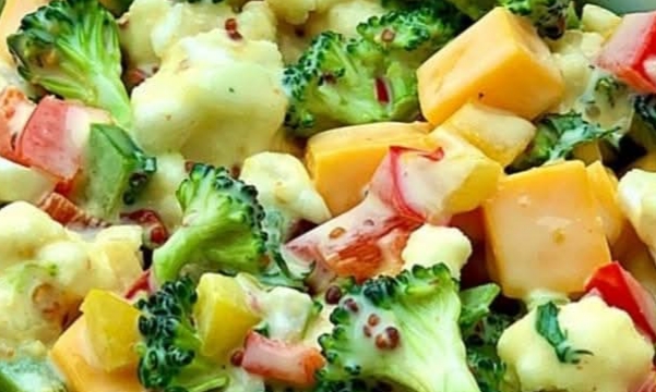 - In a large bowl, combine broccoli, cauliflower, peppers, cheese, and parsley.