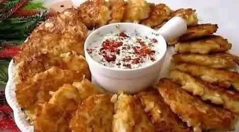 Serve the hot cabbage fritters with a dollop of the yogurt-dill sauce on top.