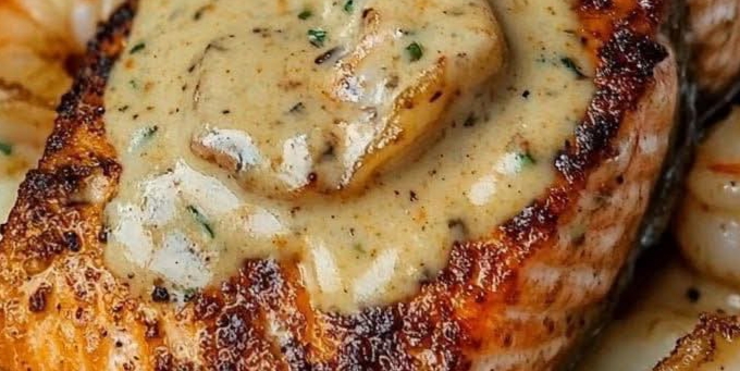 A restaurant-style Cajun seafood entrée — crispy salmon, buttery shrimp, and silky mashed potatoes drenched in a spicy, creamy Cajun sauce — bold, comforting, and irresistibly elegant.