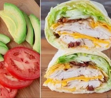 Top with lettuce and cheese. Add turkey slices, cooked bacon, avocado, tomato slices down the center of the wrap. Top with salt and pepper.
