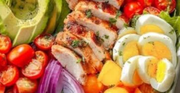 Ingredients: Fresh mixed greens or arugula Grilled chicken breast (sliced) Avocado (sliced) Red and yellow cherry tomatoes (halved) Boiled eggs…