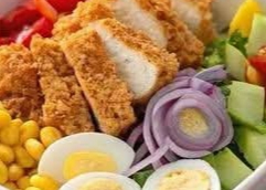 Ingredients:🥬 Mixed lettuce leaves🍗 Crispy breaded chicken breast, sliced🥚 2 hard-boiled eggs, halved🌽 ½ cup sweet corn🧅 Sliced red onions🫑…