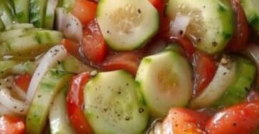Ingredients: 2 cucumbers, sliced 2 tomatoes, cut into wedges 1 small onion, thinly sliced 1/2 cup vinegar (white or apple…