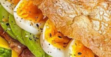 Ingredients: 1 croissant (cut in half) 2 slices cheddar cheese 2 slices cooked bacon 2 boiled eggs (sliced) 1/2 avocado…