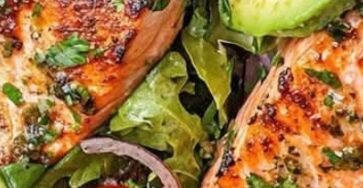 Ingredients: Grilled salmon fillets Mixed leafy greens Cherry tomatoes Avocado chunks Red onion rings Olive oil, lemon juice, salt &…