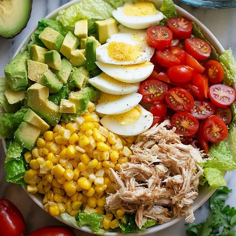 Layer Salad: In a bowl, add a bed of lettuce. Neatly arrange chicken, avocado, corn, tomatoes, and eggs in sections.