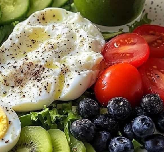 On a medium plate, layer salad greens first. Add the soft-boiled eggs, a mound of cottage cheese, sliced brie, tomato, cucumber, kiwi, and fresh berries.