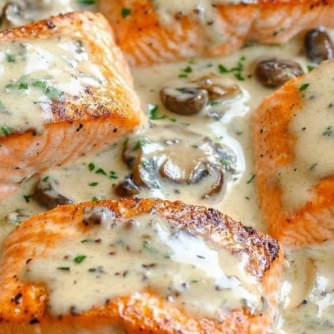 1. **Sear the Salmon:**– Heat olive oil or butter in a large pan over medium-high heat.– Season the salmon fillets with salt and black pepper.– Sear for 4-5 minutes on each side until golden brown. Remove from the pan and set aside.2. **Prepare the Creamy Mushroom Sauce:**– In the same pan, add minced garlic and sliced mushrooms.– Sauté for 3-4 minutes until the mushrooms are tender.3. **Make the Sauce:**– Pour in the broth and heavy cream, then stir in Parmesan cheese, Dijon mustard (if using), and Italian seasoning.– Let the sauce simmer for 3-5 minutes until it thickens.4. **Combine Everything:**– Return the salmon fillets to the pan, spooning the sauce over them.– Simmer for another 2 minutes until the salmon is heated through.5. **Serve & Garnish:**– Sprinkle with fresh parsley and serve hot with rice, pasta, or roasted vegetables.—**Tips for the Best Creamy Garlic Mushroom Salmon:**– **Use Fresh Salmon:** Opt for fresh, high-quality salmon fillets for the best texture and flavor. If using frozen salmon, thaw completely and pat dry before cooking.– **Pat the Salmon Dry:** Before seasoning, pat the fillets dry with a paper towel to help achieve a nice golden sear.– **Don’t Overcook the Salmon:** Cook just until it flakes easily with a fork (about 4-5 minutes per side, depending on thickness). Overcooked salmon can become dry.– **Sear the Salmon First:** Cooking the salmon first ensures a crispy, flavorful crust. Remove it from the pan before making the sauce to prevent overcooking.– **Use Heavy Cream for the Best Texture:** Heavy cream creates a rich, smooth sauce. For a lighter option, use half-and-half or a dairy-free alternative like coconut cream.– **Let the Sauce Thicken:** Simmer the sauce for a few minutes to allow it to reduce and intensify in flavor before adding the salmon back in.– **Add Parmesan for Extra Depth:** Freshly grated Parmesan enhances the creamy texture and adds a delicious umami taste.– **Customize the Flavors:** Add a splash of white wine for extra depth, a pinch of red pepper flakes for heat, or a squeeze of lemon juice for a refreshing tang.– **Pair It Well:** Serve with mashed potatoes, rice, pasta, or roasted vegetables to soak up the delicious sauce.– **Garnish for Freshness:** A sprinkle of fresh parsley or basil adds a bright, fresh contrast to the creamy sauce.—Enjoy this **Creamy Garlic Mushroom Salmon** as a luxurious yet easy-to-make meal that’s sure to impress! 🐟🍄✨
