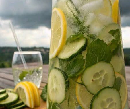 In a large pitcher, combine the cucumber, lemon, and mint leaves.