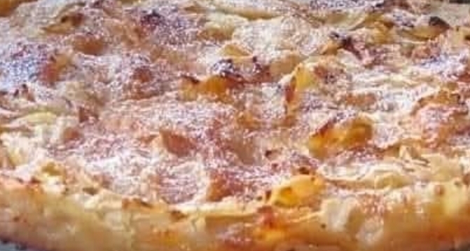 error. I love apple pies but sometimes do not have time to make crusts so I came up with this. The recipe is easy and quick to make and served warm with ice cream makes a nice company desert. As you can see my Hubby didn’t let me get my picture before digging in.-I saw this recipe and it sounded good and my husband loves apple crisp so I made it. I was not very tasty, kind of flat and the writer said to pour the topping mix on top of the apples, there is no way you could pour the mixture it was sticky and gooey and I had to take a big spoon and try to lay it on top of the apples. The topping did not have much of a flavor. Probably won’t make it again.-I made this yesterday and was quite disappointed. As others had said, the topping was quite thick but since this recipe had gotten raves for the most part I though that’s the way it was supposed to turn out as the staff made no mention of the heavy, thick topping. (Not to sound disrespectful but I’ve never read any negative reviews from the Test Kitchen.) I used 4 extra large Granny Smith apples and an 8″ deep dish pie plate. I didn’t care for the end product nor did my family. Even using a lot of apples, there was not only too much topping but it wasn’t sweet enough. As others had stated, I prefer an apple crisp that has the crumb topping.Ingredientspeel and slice enough apples to cover bottom of pie plate ( I use an 8 inch plate)TOPPING2 eggs1 c sugar ( reserve out a 1/4 cup and to this I add 1 teaspoon cinnamon)2 Tbsp melted butter or maragrine1 c all-purpose flour1 tsp baking powder1 tsp vanillaPreparation1. Mix all topping ingredients except reserved cinnamon sugar. Sprinkle cinnamon sugar over top of apples and then pour topping over top of all.2. Bake in a 350 degree oven for 40-45 minutes or until topping is firm and golden brown.Last Step: Don’t forget to share!Enjoy !