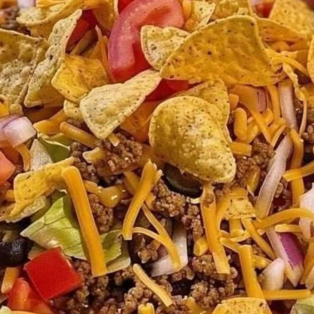1 large bag Dorito Nacho Cheese Chips, broken into smaller pieces, but not crumbs • 1 pound lean ground beef • 1 packet taco seasoning • 1 red onion, diced • 2 cups cheddar cheese, shredded • 1 head lettuce, shredded • 6 tomatoes, chopped • ½ cup Italian dressing • 2 cups ranch dressing PreparationIn a skillet crumble and brown the lean ground beef. Drain the excess fat from the pan when done cooking Add in the packet of taco seasoning mix. Add the two dressings, the Italian and the Ranch, stir to combine and simmer until the liquid is soaked up Shred the lettuce and place in a bowl. Chop the tomatoes and place in another bowl Dice the onion and place into a third bowl. Place the cheese into a large bowl Instead of putting the last few ingredients into bowls, you can mix it all together with the meat. Placing the ingredients in separate bowls allows each person to add what they would like on the salad. Plus, if there are any of the ingredients left over, they can be packaged separately in the refrigerator.