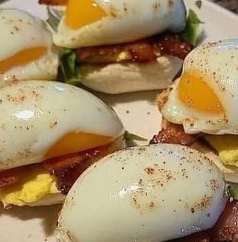 Put the other half of the egg face down on top to create a little sandwich. Secure the egg bite with a toothpick inserted down the center.