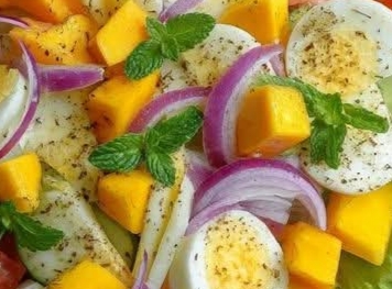 3 boiled eggs½ cup lettuce¼ cup cucumber slices¼ cup tomato slices¼ cup diced mango¼ cup red onion slicesFresh mint leavesBlack pepper & salt