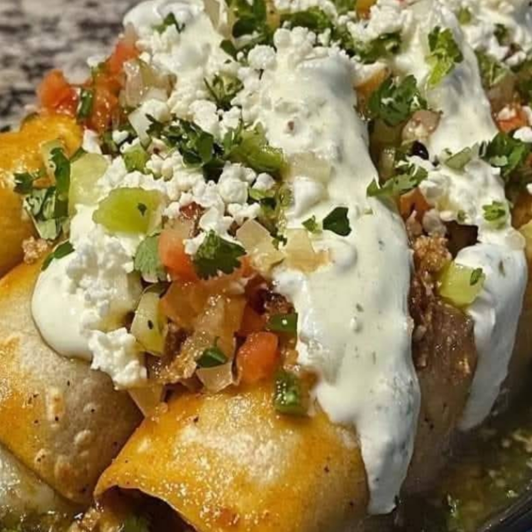 Make the salsa verde :Place the tomatillos, onion, and chilies in a saucepan.Add water to slightly cover the ingredients and simmer for 10 minutes or until everything is nicely cooked.Place all ingredients in a blender and add 1 cup of cooking water.Add garlic and cilantro and blend until smooth.Heat the oil in a saucepan over medium heat and pour in the tomatillo sauce.Season with chicken bouillon, pepper, and salt.Simmer for 5 minutes or until the sauce thickens, adjust seasonings and turn off the heat. Allow to cool down to room temperature.Make the flautas:Heat the tortillas on a pan or cast-iron skillet until soft and pliable.Place a tortilla flat on a surface and add some chicken to one side.Roll the tortilla tightly into a tube-like shape. Place it seam-side down or secure it with a toothpick. Repeat until all tortillas and filling are usedHeat about 1 ½ cups of oil in a pan and fry the flautas in batches until crisp and golden.Remove them and place them on a lined paper plate or a cooling rack.Assemble:Add some salsa in the cups where you’ll serve flautas (read notes).Place 3-4 flautas nicely immersed in the sauce and then add lettuce, onions, cream, and cheese.Drizzle with more salsa if you want and serve immediately.NOTES :You can also use flour tortillas to make this recipe, just be aware that flour tortillas don’t get as crispy as corn ones, they also fry faster and tend to burn easily if you don’t pay attention to the oil temperature.You can also serve those flautas on plates, just add first some salsa, place flautas, then top with lettuce, onion, cream, and cheese. Generously add more salsa and that’s it.