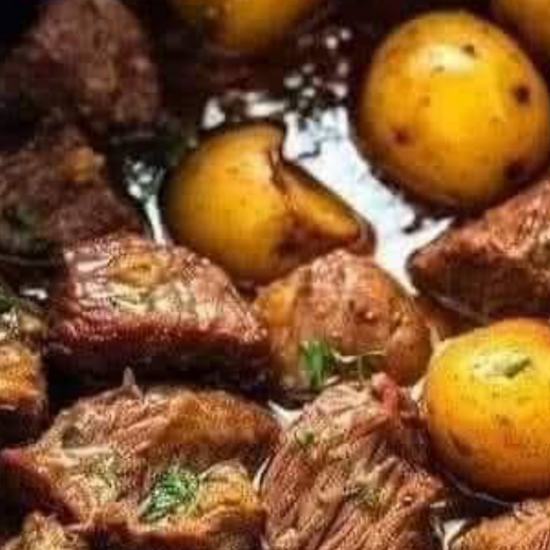 650g sirloin steak, sliced650g small yellow potatoes, cut into quarters.1 tablespoon olive oil3 tablespoons butter5 cloves garlic, crushed1 teaspoon fresh thyme, chopped1 teaspoon chopped fresh rosemary (rosemary)1 teaspoon chopped oreganoSalt and ground black pepperCrushed red pepper flakes (optional)Ingredients for marinating sauce:1/3 cup soy sauce1 tablespoon olive oil1 tablespoon hot sauceGround black pepper