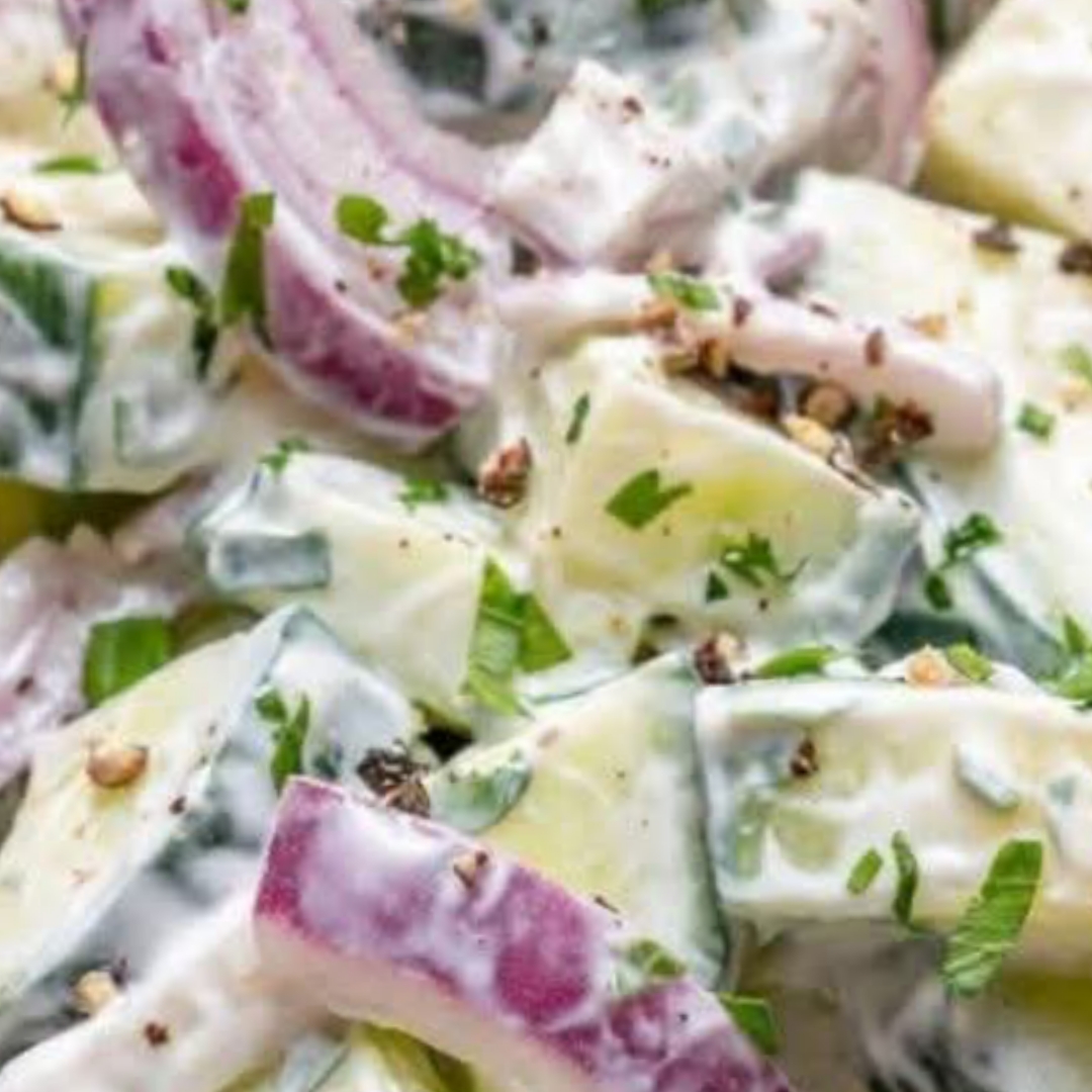 Step 1: Prepare the CucumbersWash and slice the cucumbers thinly. If using regular cucumbers, peel them to reduce bitterness. If using English cucumbers, peeling is optional.Sprinkle the cucumber slices with a pinch of salt and let them sit for 10-15 minutes. This helps draw out excess moisture and prevents the salad from becoming watery.After 15 minutes, drain the water and pat the cucumbers dry with a paper towel.Step 2: Make the Yogurt DressingIn a large bowl, whisk together Greek yogurt, minced garlic, lemon juice, olive oil, dill, salt, pepper, and cumin (if using). Mix until well combined.Step 3: Combine and ServeAdd the drained cucumbers to the yogurt mixture and toss gently to coat the slices evenly.Cover and refrigerate for at least 15-20 minutes to let the flavors meld.Before serving, garnish with fresh dill, a drizzle of olive oil, and a sprinkle of red pepper flakes for a touch of heat.