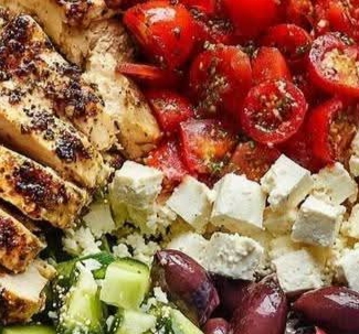 Top with chicken, tomatoes, cucumber, feta, and olives.