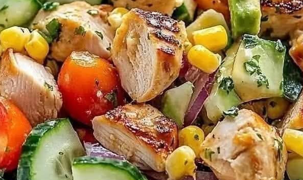 - Season chicken with salt, pepper, and a little olive oil. Grill until golden, then cut into cubes.