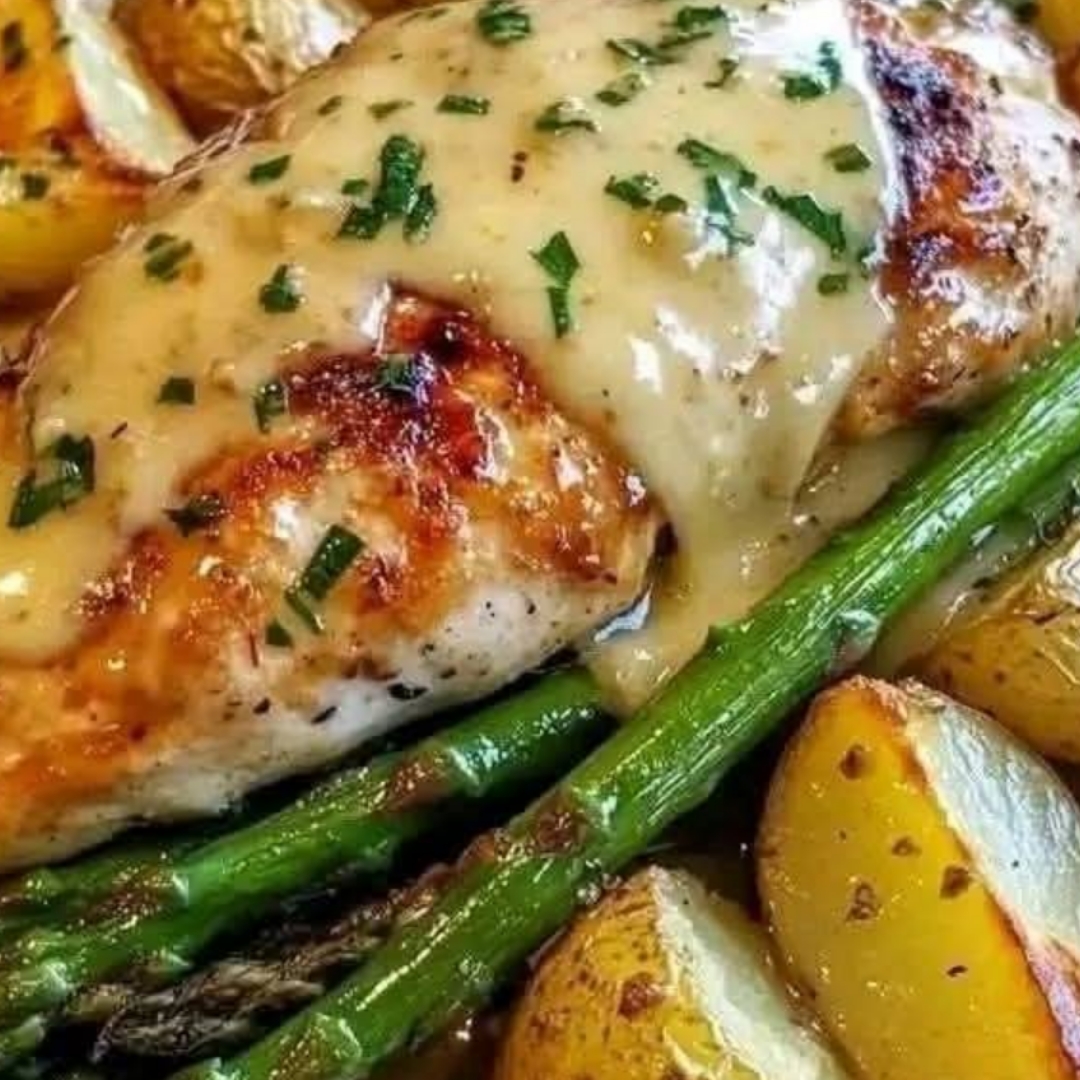 Preheat oven to 400°F (200°C).In a small bowl, mix together honey, Dijon mustard, and minced garlic.Season chicken breasts with salt and pepper. Set aside.ADVERTISEMENTToss cubed potatoes in olive oil, salt, and pepper. Spread on a baking sheet and roast for 20 minutes.While potatoes are roasting, heat a skillet over medium-high heat.Sear chicken breasts for 2–3 minutes per side until golden.Remove chicken from heat and brush generously with the honey mustard mixture.Add asparagus to the baking tray with potatoes. Place the seared chicken on top.Roast everything together in the oven for 15–20 more minutes, until chicken is fully cooked and potatoes are crispy.ADVERTISEMENTDrizzle remaining honey mustard sauce over the chicken.Garnish with fresh herbs and serve hot.Time & NutritionPrep Time: 10 minutesCook Time: 35–40 minutesTotal Time: ~50 minutesServings: 4Calories: ~420 kcal per serving (without cheese)Serving SuggestionsServe with crusty bread, rice pilaf, or a side salad.Add grated Parmesan or cheddar over potatoes for a cheesier twist.ADVERTISEMENTLeftovers work great in wraps or lunch bowls the next day.