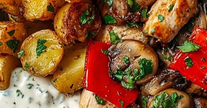 Preheat oven to 425°F (220°C). Toss baby potatoes with olive oil, garlic powder, rosemary, salt, and pepper. Roast on a baking sheet for 25–30 minutes until crispy and golden. Meanwhile, sauté chicken cubes in olive oil over medium-high heat for 5–7 minutes until lightly browned. Add mushrooms and red peppers, season with garlic powder, oregano, salt, and pepper, and cook for another 5–6 minutes until tender and cooked through. For the dip, stir all ingredients together and chill. Assemble in containers with a portion of potatoes, chicken-veggie mix, and a scoop of the yogurt dip. Garnish with fresh parsley.