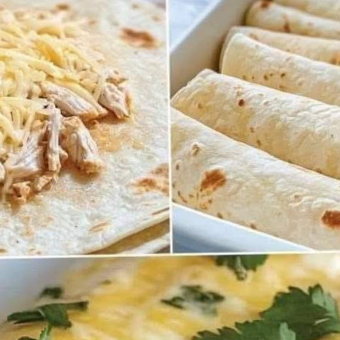 2 cups shredded cooked chicken1 cup shredded mozzarella or Monterey Jack cheese (plus more for topping)1 cup sour cream1/2 cup heavy cream4 oz cream cheese, softened1/4 cup chicken broth1/4 cup green chiles (canned or fresh)1 tsp garlic powder1 tsp onion powderSalt and pepper to tasteLow-carb tortillas (store-bought or homemade)