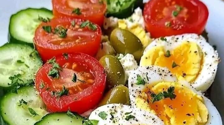 A refreshing, protein-rich plate with smashed avocado toast, soft-boiled eggs, feta, olives, cucumber, and juicy tomato a balanced breakfast or light lunch full of Mediterranean flair.