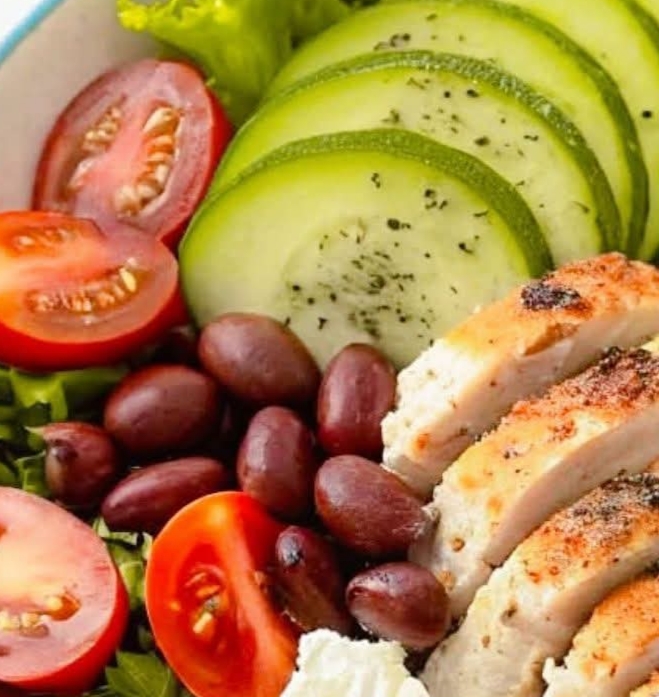 Arrange the salad: Start with lettuce at the base, then layer with cucumber, tomatoes, olives, feta, egg, and chicken.