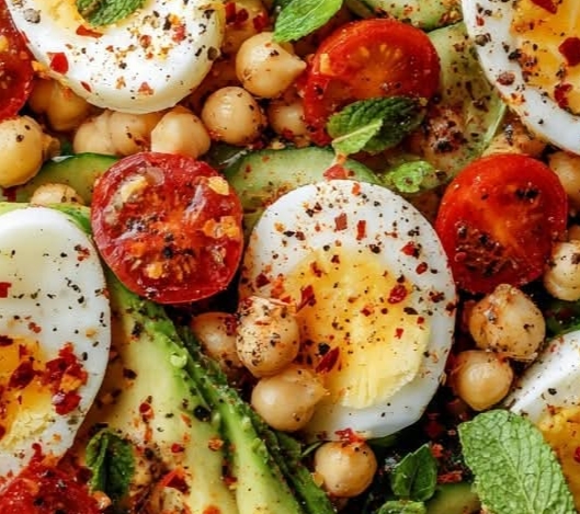 Arrange cucumber, tomatoes, chickpeas, and avocado in a bowl.