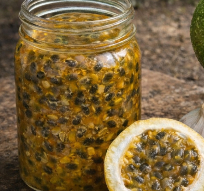 - Add the garlic to the passion fruit pulp.