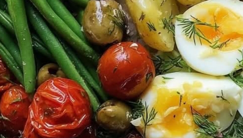 Assemble the salad: On a large plate, arrange salad greens, potatoes, eggs, salmon, green beans, tomatoes, and olives.