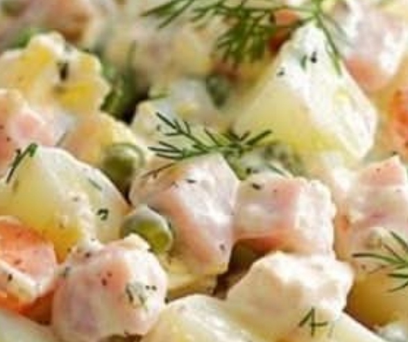 Start by boiling the potatoes and carrots until tender. Allow them to cool, then peel and dice them into small cubes.In a large mixing bowl, combine the diced potatoes, carrots, cooked peas, diced ham or chicken, chopped hard-boiled eggs, diced cucumber, and diced dill pickles.In a separate small bowl, mix together the mayonnaise and Dijon mustard until smooth.Pour the dressing over the salad ingredients and gently toss until everything is evenly coated.Season the salad with salt and pepper to taste.Cover the salad and refrigerate for at least 1 hour to allow the flavors to meld together.Before serving, give the salad a final toss and adjust seasoning if needed.Garnish with fresh dill if desired.Serve the Olivier salad chilled as a side dish or as a light meal on its own.