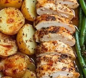 Preheat oven and lightly grease a baking dish. Toss halved potatoes with olive oil, garlic, and seasoning, then place them on one side of the dish. Season the chicken with olive oil, garlic, herbs, paprika, salt, and pepper, and place in the center. On the other side, lay green beans tossed in olive oil, garlic, and salt. Roast until the chicken is golden and cooked through, the potatoes are crispy, and the beans are tender. Slice the chicken and serve with the veggies, spooning over any pan juices.