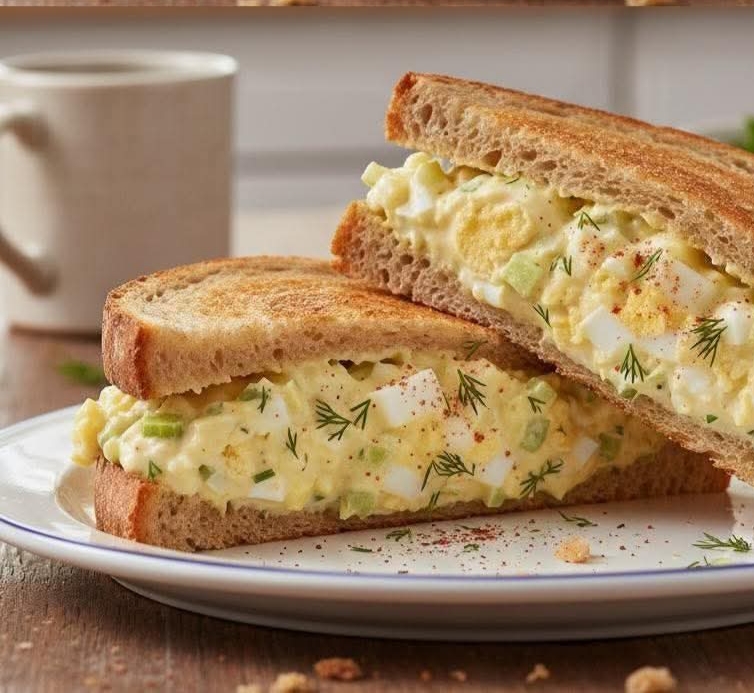 Toast your bread slices until golden brown. Spread the egg salad generously onto one slice of bread, then top it with the other slice. - Garnish and Serve: