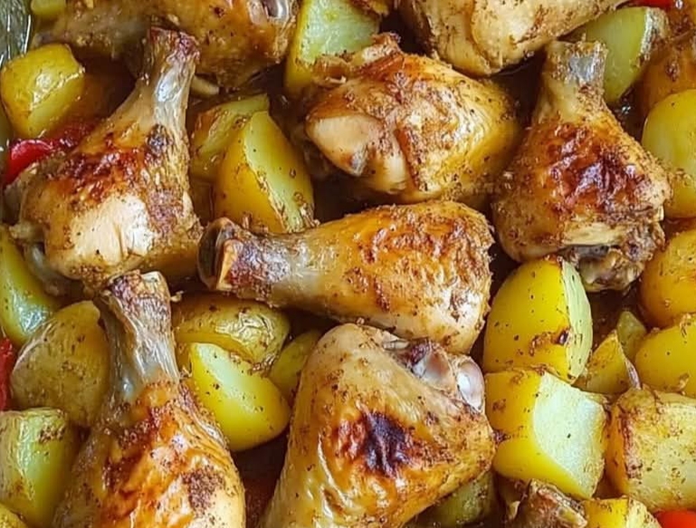 Roast in the preheated oven for 40–45 minutes, flipping the chicken halfway through and stirring the potatoes occasionally, until the chicken reaches an internal temperature of 165°F (74°C) and the potatoes are tender and golden.