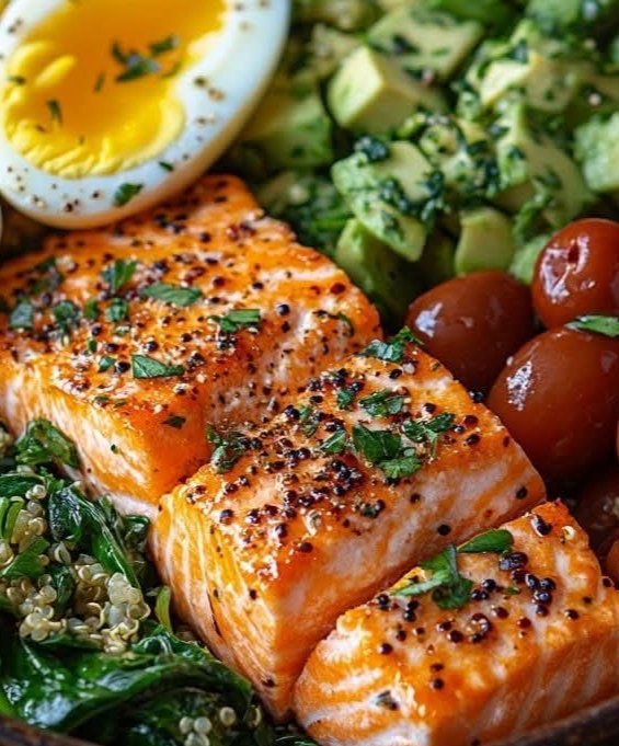 In a large bowl, layer cooked quinoa, sautéed spinach, salmon chunks, egg halves, avocado cubes, and cherry tomatoes.
