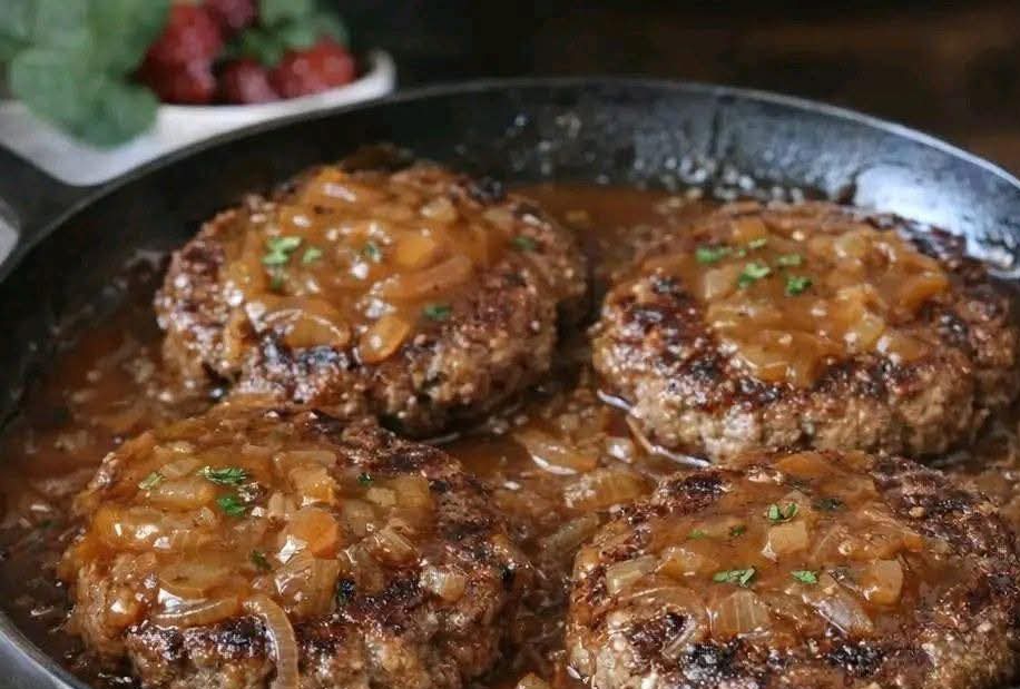 Smother the steaks: Return the cooked hamburger steaks to the skillet, spooning the gravy over them. Let them simmer in the gravy for another 5 minutes, allowing the flavors to meld together. ![]()