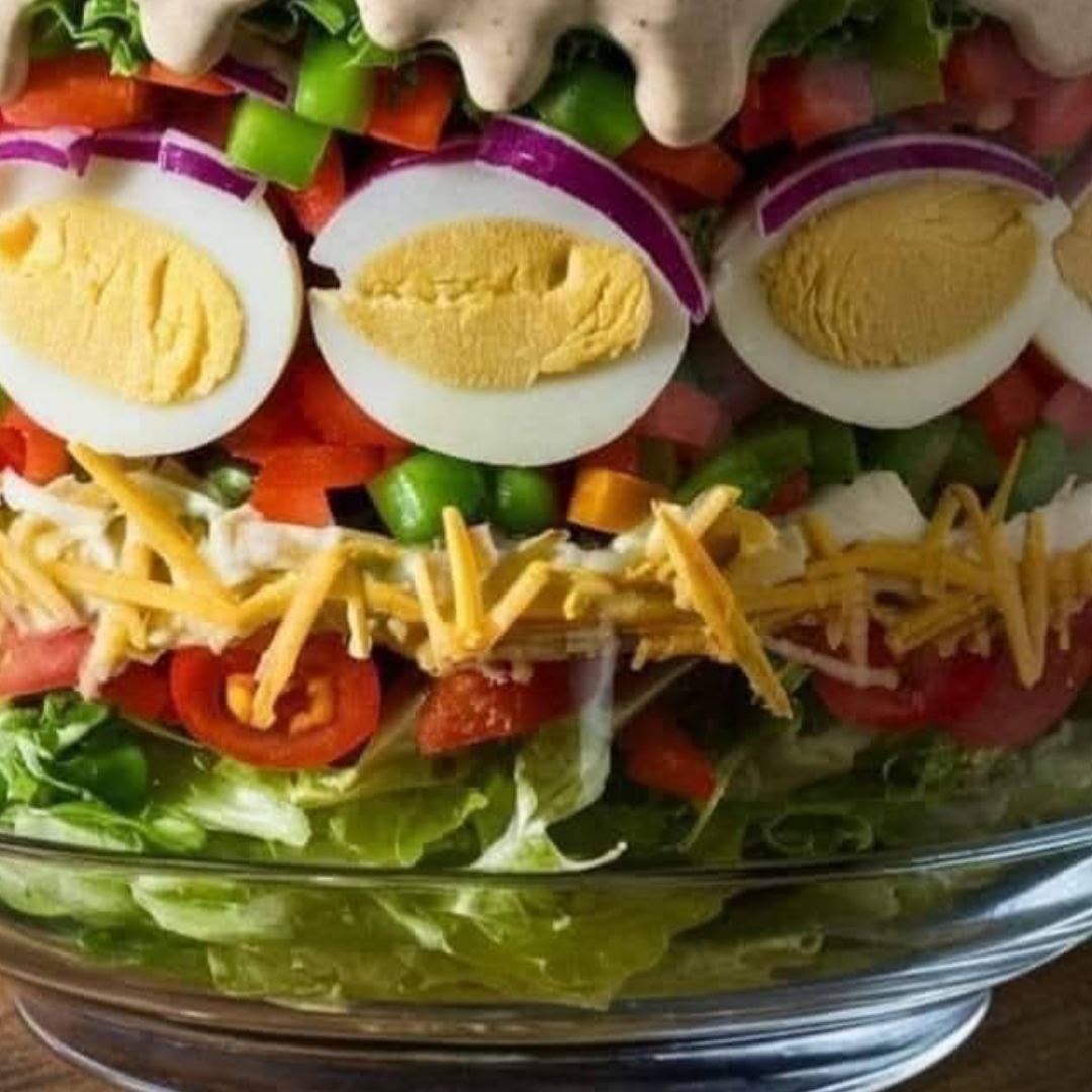 head iceberg lettuce, chopped1 cup cherry tomatoes, halved1 cup cucumbers, sliced1 cup frozen peas, thawed6 hard-boiled eggs, chopped2 cups shredded cheddar cheese8 slices bacon, cooked and crumbledDressing:◦ 1 cup mayonnaise◦ 1/2 cup sour cream◦ 2 tablespoons sugar◦ Salt and pepper to taste