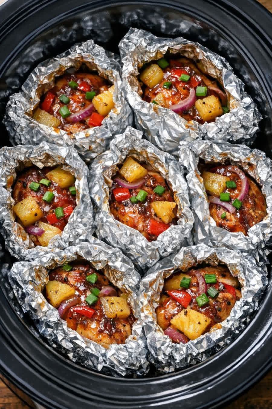 Seal the packets: Bring the long sides of each foil sheet up and together over the chicken and pineapple, then fold them down together several times to create a tight seal. Fold up and crimp the shorter ends of each packet so no liquid can escape. You should now have 4 individual foil packets nestled together inside the slow cooker.