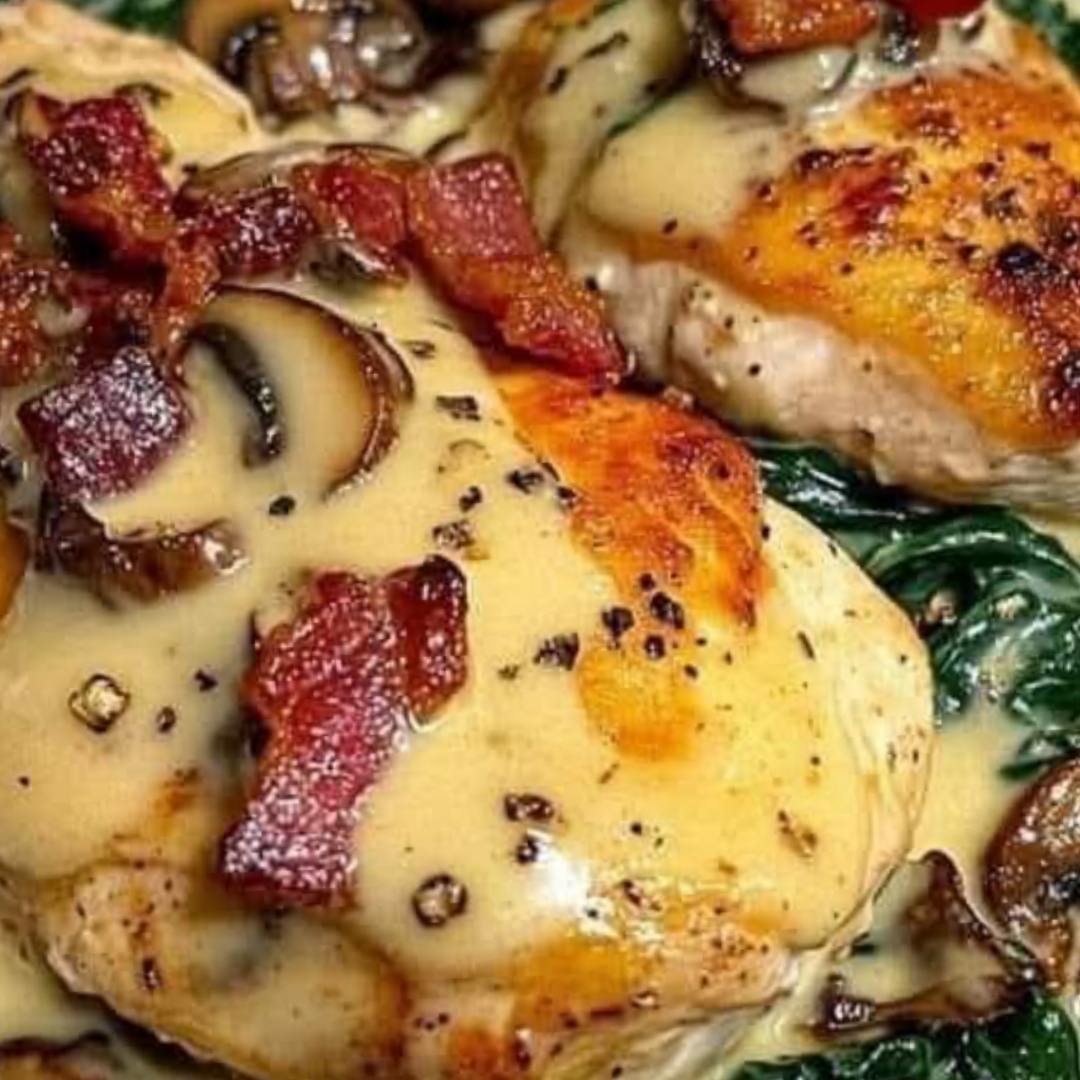 To Make the Chicken: Rub salt and pepper onto the chicken breasts on both sides. With the heat set to medium-high, warm the olive oil in a big skillet. Once the pan is hot, add the chicken breasts and cook for 5 to 7 minutes each side, or until cooked through and golden brown. Before setting aside, take the chicken out of the pan.Crisp Up the Bacon: Toss in the chopped bacon to the same pan and sauté until golden and cooked through. After removing the bacon from the pan, set it on a paper towel-lined dish to soak up any leftover grease. Be sure to save a couple of tablespoons of bacon grease for later use.The chopped onion should be sautéed for two or three minutes, or until it becomes translucent, as part of the vegetable sautéing process. After approximately 5 minutes of heating, add the sliced mushrooms and minced garlic. Continue cooking until the mushrooms are soft and browned.Whirl some fresh spinach in a pan and set it aside to prepare for the creamed spinach. Combine the grated Parmesan cheese with the heavy cream and mix to combine. After a few minutes of simmering, add the Italian spice and continue cooking until the sauce thickens. Add salt and pepper according to your preference.After the chicken breasts have cooked, put them back in the pan with the spinach and mushrooms, and simmer the mixture until it thickens. Top with a little crispy bacon. Allow the chicken to boil through and the flavors to combine by letting everything simmer together for around 5 minutes.Before serving, ladle the mushroom sauce, bacon, and spinach mixture over the covered chicken. Toss in some fresh parsley for garnish, if you want. Accompany with your preferred side dishes, such as mashed potatoes, rice, or a basic green salad, and serve hot.The Rich and Savory Distinction of This Recipe: A luscious sauce made with earthy mushrooms, crisp bacon, and creamy spinach goes well with the succulent chicken breasts.This dish looks fancy, but it’s really quite simple and easy to follow, so it’s perfect for weekday meals or a big event.Flexible: Make this recipe your own by changing the ingredients and cooking method. To spice things up, try including sun-dried tomatoes or bell peppers, or switch up the cheese for something new.Smothered Chicken with Creamed Spinach, Bacon, and Mushrooms is the pinnacle of comfort food, with its substantial ingredients and creamy texture, certain to warm you up from the inside out.